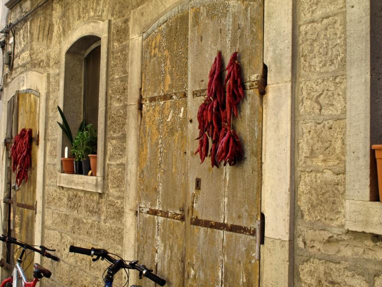A pensarci bene, anche i peperoni cruschi delineano le fattezze di quel vecchio mondo. Venivano, un tempo, infilati a mano in corone e collane di cotone, restando, durante la stagione, appesi sulle pertiche ad essiccare. Il dialetto nzerta porta alla mente l’idea di punte acuminate, di aghi e crune adatti a trafiggere più che legare, e tuttavia pare che in latino il termine significasse proprio legare insieme, da cui appunto ghirlanda e corona. Sono frutto della pazienza, i peperoni cruschi, del tempo giusto, del clima secco dell’Italia interna, e di un’attesa che oggi diremmo del tutto antieconomica. Forse per questo appartengono a quel mosaico variegato di sapori dato dall’antica policoltura mediterranea. Riguardano una delle mille esperienze e abilità di cui il vecchio homo faber, caro a Hannah Arendt, era capace.