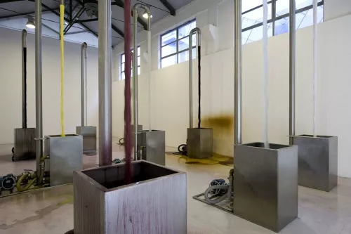 Nei decenni successivi, per molte ragioni, l’idea di scultura-macchina è rimasta marginale nella produzione artistica. (Le eccezioni sono appunto tali, e confermano la regola). In Italia, però, gli ultimi cinque o sei anni sembrano aver conosciuto una ripresa di interesse per questa possibilità creativa. Sono macchine, congegni, dispositivi tutte le creazioni maggiori di Micol Assaël, Michele Bazzana, Arcangelo Sassolino, Alberto Tadiello (tre su quattro dal Nord-Est, per inciso, ancora una volta), per non parlare degli artisti che ricorrono alla macchina in modo meno sistematico. Come Paola Pivi, ad esempio, che nel 2009 ha presentato a Francoforte e a Milano una serie di austere fontane d’acciaio che pompavano, invece che acqua, torrenti di liquidi di consumo quotidiano, dal succo d’arancia a un prodotto struccante per il viso.