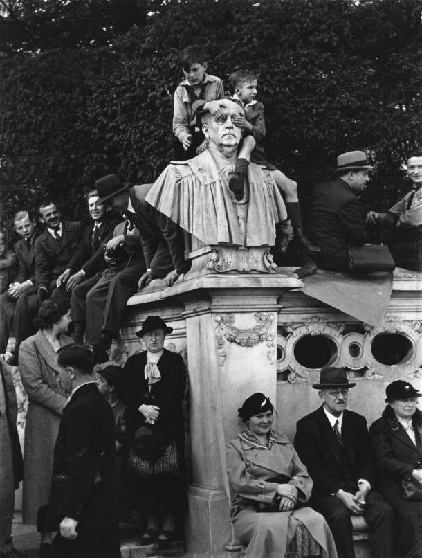 Un’altra foto mette a fuoco dei bambini arrampicati su una statua, uno in divisa da piccolo hitleriano, l’altro che si sostiene in bilico afferrandosi alle cavità degli occhi del grande busto di marmo, come per evitare al nobile antenato di guardare la sfilata. La maggioranza dei presenti sorride come in una sagra; solo una signora in nero, molto seria, sembra aver scoperto il mirino della camera che la scruta individuandola come immagine centrale nel complesso: lei, che porta in mano un cappello che probabilmente appartiene alla ragazza sorridente che le sta vicina e sembra prestare attenzione a una simpatica battuta del giovane affacciato dalla base della statua che presiede alla scena.