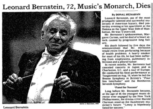 Il 15 ottobre 1990, la mattina dopo la morte di Leonard Bernstein, il New York Times dava alla notizia l’apertura della prima pagina: il massimo dell’importanza e della visibilità. Il dettagliato e amplissimo “obituary”, firmato dal premio Pulitzer per la critica musicale Donal Henahan, era corredato da una fotografia di due anni prima, che lo ritraeva frontalmente sul podio – tipica l’espressione, appesantito il fisico – bacchetta in pugno e nella mano sinistra, un po’ incongruamente, un paio di occhiali.