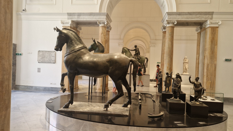 È poi sempre un’esperienza emozionante rivedere, all’ingresso del museo, in ouverture della sezione dedicata alla Campania Romana, la monumentale Quadriga di Ercolano (bronzo, tra il 14 e il 68 d.C.), che, rinvenuta nel 1739, è stata qui ricomposta per la prima volta nel 2023, quand’era direttore Paolo Giulierini. Vi si ammira il Cavallo Mazzocchi, così detto dall’iscrizione presente sulla sua base (Alessio Simmaco Mazzocchi 1684/1771, fu un archeologo capuano). La composizione della quadriga è analoga ai molti esempi di quadrighe trionfali che ci ha restituito l’arte romana di età imperiale. Era formata da un tiro a quattro cavalli e da un carro di forma semiovale su cui era collocata la statua del trionfatore (ferve la ricerca dei suoi frammenti nei depositi per poterla ricostruire). La cassa del carro era decorata da grandi figure bronzee ad altorilievo, applicate alle sue sponde (quelle sopravvissute alla furia del vulcano si possono ammirare in mostra) che, ispirate a tipi statuari tardo-classici ed ellenistici, celebravano divinità e forse anche membri della famiglia imperiale giulio-claudia. (In questo video la genesi della sua ricostruzione). La ricostruzione è stata resa possibile sia dalla revisione dei dati archeologici che grazie alle moderne tecnologie.