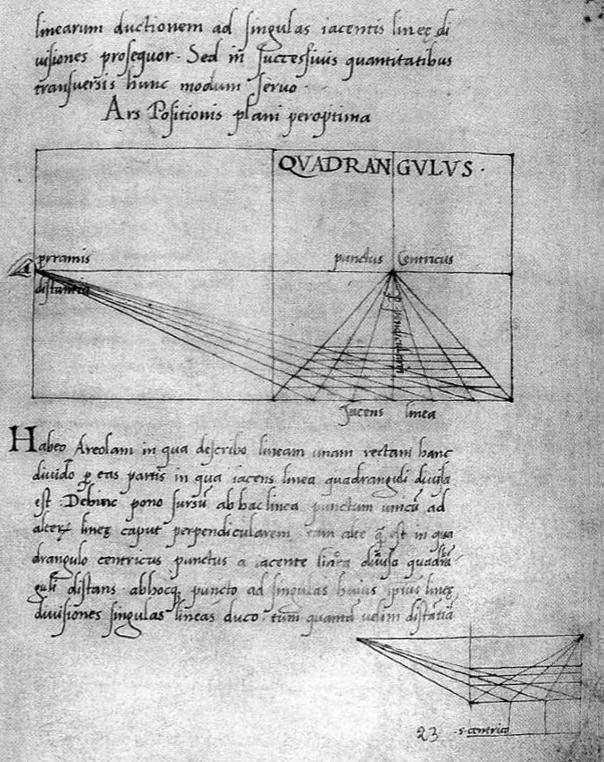 Lucca, Biblioteca Governativa, ms. 1448, (cc.1r-8r: Elementa picture nella redazione latina con lettera a Teodoro, cc.8v-53v: De pictura nella redazione latina con lettera al Gonzaga, cc.53v-54r: De punctis et lineis apud pictores). Nel manoscritto albertiano del Cinquecento, l’immagine di un occhio materializza il punto geometrico della costruzione prospettica .