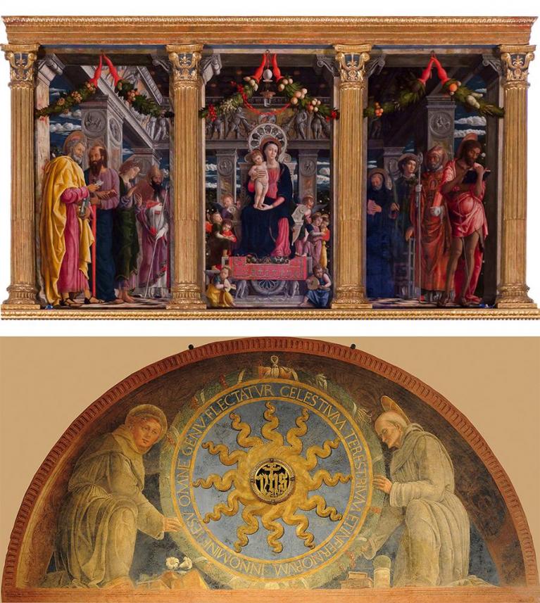 Andrea Mantegna, scomparto centrale, sinistro e destro della Pala di San Zeno, 1456-1459. Verona, basilica di San Zeno / Sant’Antonio di Padova e San Bernardino da Siena presentano il monogramma di Cristo, 1452. Padova, Museo Antoniniano. L’affresco, che accoglie il visitatore della mostra al Piano Nobile di Palazzo Madama, rappresenta in scorcio dal basso i due santi e alcuni oggetti appoggiati sulla cornice inferiore della lunetta resi con una prospettiva d’effetto.