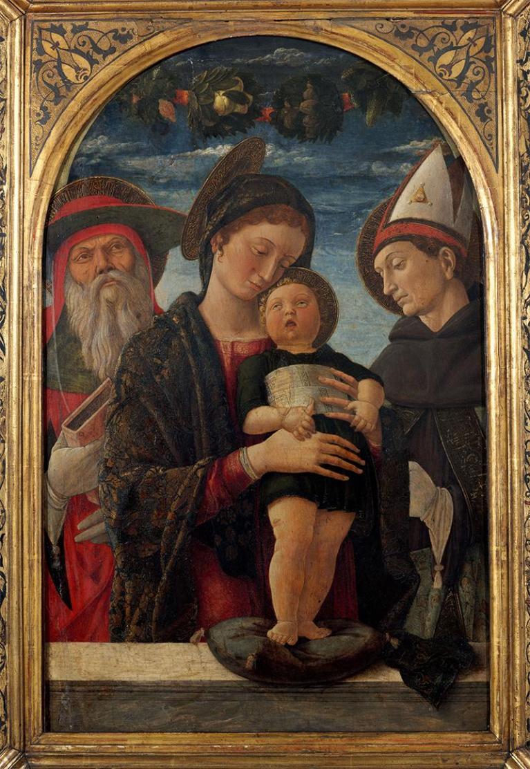 Andrea Mantegna, Madonna con il Bambino e santi Gerolamo e Ludovico di Tolosa, 1453-1454 circa. Parigi, Institut de France, Musée Jacquemart-André.