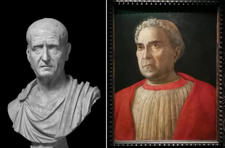 Ritratto di Decio, 249 circa. Roma, Musei Capitolini / Andrea Mantegna, Ritratto del cardinale Ludovico Trevisan, 1459-1460 circa. Berlino, Staatliche Museen zu Berlin, Gemäldegalerie.