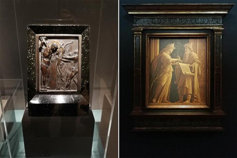 Donatello, Martirio di San Sebastiano, 1450-1452 circa. Parigi, Institut de France, Musée Jacquemart-André / Andrea Mantegna, Donna vestita all’antica e vecchio in panni orientali (Sibilla e profeta?), 1495. Cincinnati, Cincinnati Art Museum, Bequest of Mary M. Emery.