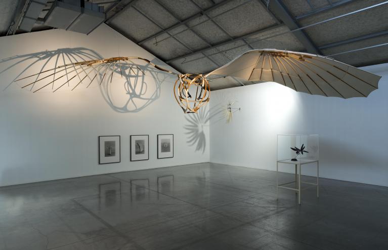 Quest’ultima opera, come le prime due , è visibile ora in L’Envol, ou le rêve de voler, l’esposizione in corso (fino al 28 settembre) alla Maison Rouge, che conclude, dopo quattordici anni, le attività dello spazio parigino. Compendio degli interessi e del gusto che hanno segnato tutto il programma precedente, la mostra si presenta come un assemblaggio tematico, una campionatura eclettica più che un percorso storico. Il volo, in questa prospettiva, è anzitutto una piega dell’immaginario, un atto metaforico, un “possibile” da esplorare col corpo, i sensi, la tecnica, l’utopia, il sogno. L’allestimento si sottrae dunque a qualsiasi linearità cronologica, preferendo accostamenti e contrapposizioni spesso studiate per generare il massimo effetto sorpresa. Luna (1968), un ambiente chiuso e in penombra, dal pavimento ricoperto con uno spesso strato di granuli bianchi di polistirolo, in cui Fabio Mauri prefigurava lo sbarco sul nostro satellite, corona così un percorso in cui si possono incontrare l’improbabile macchina per volare di Gustav Mesmer, inventore e paziente psichiatrico ossessionato dal sogno del volo, il prototipo Letatlin (1929-32, ricostruito nel 1991), a metà strada tra invenzione leonardesca ed exploit tecnologico, del costruttivista sovietico Vladimir Tatlin, le inquietanti appendici piumate di Rebecca Horn, o i modellini volanti di elicotteri che sciamano come insetti nel video di Roman Signer 56 kleine Helikopter (2008).