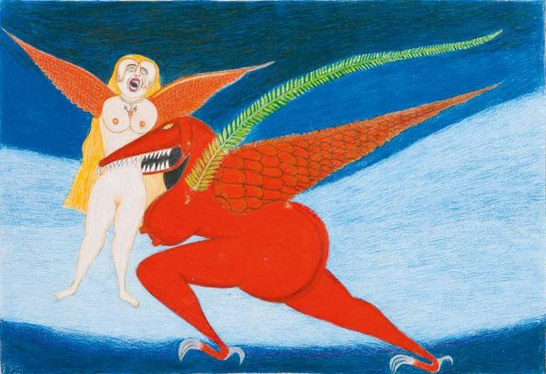 I momenti più singolari e intensi di L’Envol sono quelli in cui il tema è sviluppato in sensi meno letterali, dove il volo diviene elevazione spirituale, o spiritista, delirio visionario, danza, allucinazione. In linea con la passione per l’art brut e le figure marginali e idiosincratiche che ha sempre caratterizzato il programma della Maison Rouge, questi passaggi sono spesso affidati a outsiders come Friedrich Schröder Sonnenstern (1892-1982), i cui pastelli colorati sono stati molto amati dai surrealisti, lo statunitense Henry Darger (1892-1973), con i fantastici acquarelli tratti dalla sua sterminata e delirante raccolta postuma In the Realms of the Unreal, o le multicolori evocazioni di apparizioni di UFO di Melvin Edward Nelson (1908-1992).