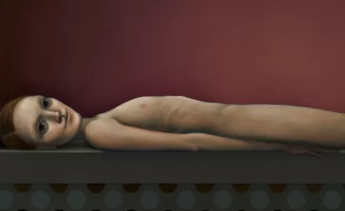 Le adolescenti della Manzelli sono le adolescenti di oggi. In Luminale lei ti guarda con gli occhi grandi come quelli di una bambina che deve ancora crescere. Solo che lei è già cresciuta, ha i piedi da donna e le mani lunghe. Eppure sembra proprio che non crescerà più di così: è stesa su un tavolo, un altare, una bara, un luogo dove si consuma il sacrificio e il pasto sacrificale sarà lei stessa. Con le ossa del costato sporgenti, con una luce negli occhi che ci guardano, come quella che hanno i bambini che sempre, qualunque cosa gli si faccia, ci chiamano. Gli occhi guardano, forse con un’ultima speranza, l’adulto che l’ha stesa su un tavolo – o su un letto, poco importa – ma da cui, in ogni caso, dipende la sopravvivenza della ragazza. Occhi che un po’ credono, non possono che farlo per tenersi stretto un barlume di vita, fino alla fine. Una fine dal sapore still life, natura morta con bambina, quasi sorridente. Un sorriso timido che sembra sperare ma non sa bene cosa aspettarsi davvero, oppure che – orrore! – pur dalla condizione di morta vivente, ammicca al carnefice.