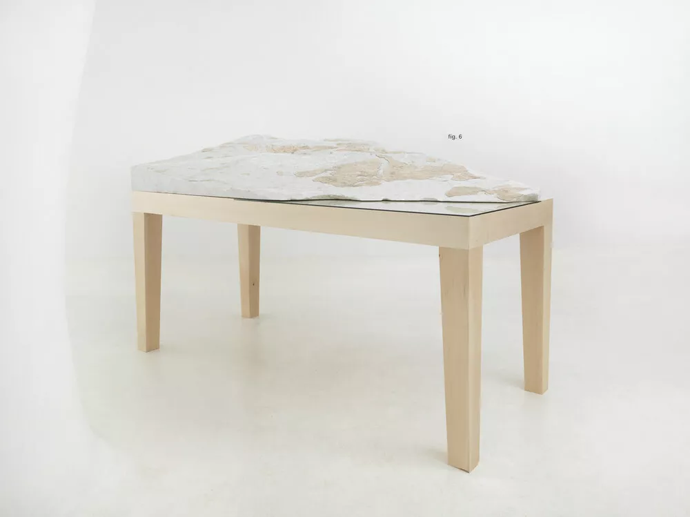 Alle coordinate temporali che emergono da questa prima maquette fanno eco quelle spaziali della seconda (Maquette, 2013) dove invece è una bussola ad essere innestata sul reperto di manto stradale. Infine in un terzo modello, il taglio superiore di uno scarto marmoreo, già superficie calpestabile di una montagna, ne diventa la sua riproduzione in scala ridotta ed è posizionato sullo stesso tavolo della Fondazione Cerere dove Moscardini ha immaginato il progetto nella sua interezza. Non proprio lo stesso tavolo, ma una riproduzione fedele, al punto da mantenerne quelli che l’artista chiama “errori strutturali”, come le zampe su cui poggia – parallelepipedi irregolari, più sottili nella parte inferiore – e da essere troppo piccolo per contenere interamente la schiena della montagna, che eccede i confini spaziali e geometri del tavolo. Anche la montagna che qui si specchia su una lastra di vetro, come su un lago, prevede un ingresso al suo interno scavato in un punto nascosto al confine tra il tavolo che la sorregge e le sue pendici. È questa la Maquette con difetti sentimentali (2013), un luogo del pensiero che Moscardini si concede rompendo il rigore scientifico con cui normalmente costruisce i suoi progetti.