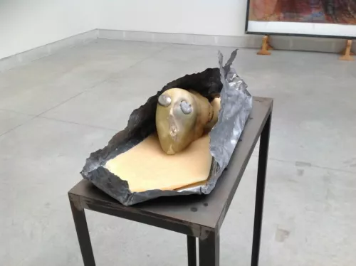 Nel padiglione ai Giardini si ritrova una sintesi di alcuni passaggi che hanno segnato lo svolgersi della parabola creativa di Marisa Merz a partire dagli anni ottanta, con un’opera priva di titolo, un ritratto femminile, dalla chioma raccolta in un gomitolo di linee, occhi e orecchie troppo grandi (Senza titolo, 1981-82), filtrato da una maglia di rame, elemento spaziale, archetipico, e topico di un vocabolario che, tra le altre cose, ha assunto il tempo e la processualità come elemento costitutivo. Se la maglia di rame diventa ciò attraverso cui la superficie pittorica esula i confini bidimensionali includendo lo spazio, altre opere integrano oggetti già dati, che nelle mani di Merz diventano ad esempio occhi, come nella testina in cera dalle forme indefinite e dai lineamenti accennati, avvolta in una lastra accartocciata (Testa, 1984-95), e una teoria di testine disegnate su carte di piccole dimensioni con innesti come foglie d’alloro e simili (Senza titolo, s.d.). Gli oggetti, assunti in termini compositivi, sono assenti nelle ultime opere su carta, come Terra nuova (2013) o Vicino molto vicino (2013), dove l’ambiguità tra la spazialità e la dell’opera si proietta invece nella monumetalizazione di un supporto fragile e leggero come la carta, che sembra elevarsi al livello di pale d’altare spogliate dalla ricchezza sacrale. Le figure rappresentate sembrano infatti angeli e Madonne dai lunghi e lisci capelli, con sinuose ali.