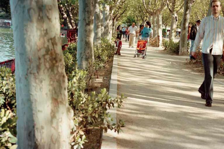 Mi sono ricordato di questo aneddoto quando ho visto la mostra di Marina Ballo Charmet, Sguardo terrestre, curata da Stefano Chiodi al MACRO nel 2013. Nella sala conclusiva e apicale dell’esposizione, infatti, era esposto un trittico (spesso le immagini di Ballo Charmet sono composte in successione orizzontale, mimando un “effetto panoramica”) tratto dalla serie Il Parco del 2006: immagini riprese in un parco parigino e intitolate appunto Paris, Les Buttes Chaumont. Ora, proprio in virtù di quello che potremmo definire il nostro inconscio cinematografico, quando vediamo una successione orizzontale di immagini siamo portati a ricondurla a una sequenza lineare, cioè a un ordine temporale – per noi che leggiamo da sinistra a destra – uniforme: a sinistra il “prima”, a destra il “dopo”.