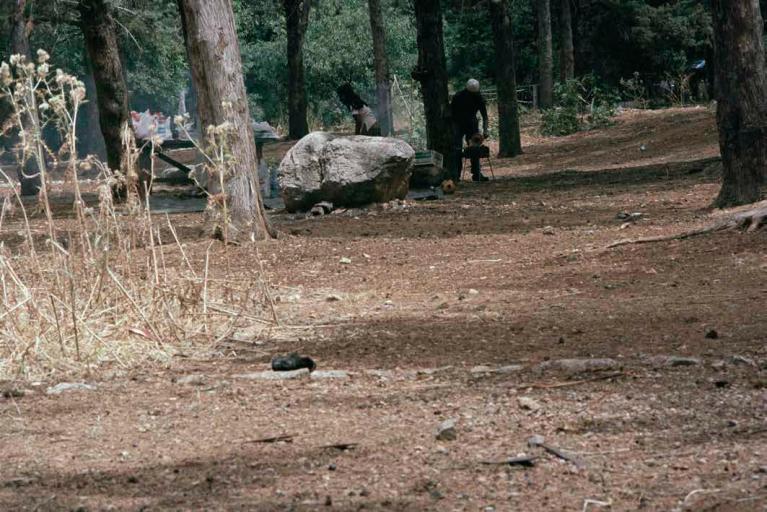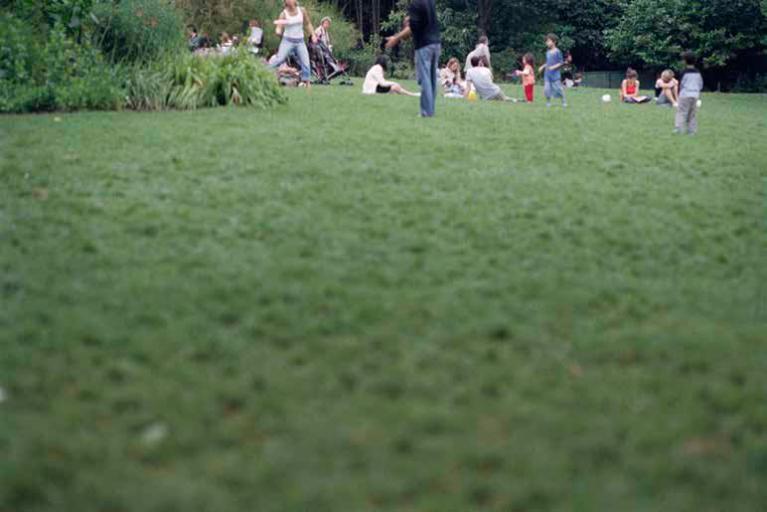 Ma Marina Ballo Charmet disattende alla radice il presupposto di tale linearità («la sequenza, la ripetizione di fotografie di uno stesso soggetto, non ha per me un valore cinetico, né suggerisce una lettura da sinistra a destra, ma ha invece a che fare con una sorta di interruzione della narrazione»: Con la coda dell’occhio, p. 28). Le tre immagini – che riprendono persone sdraiate nell’erba a prendere il sole o a leggere il giornale, più lontano dei bambini che giocano coi loro genitori – hanno in comune gli stilemi cui il linguaggio dell’autrice ci ha abituato: il piano della composizione è s-centrato dall’abbassamento della prospettiva (sicché al centro dell’immagine non si trova il suo presunto “soggetto”, quello che ho appena descritto, bensì l’erba che si frappone fra esso e l’occhio della macchina) e la sua superficie è “macchiata” dal fuoco ondivago, che restituisce con precisione determinate parti del piano “allontanandone” altre in tratti più confusi.