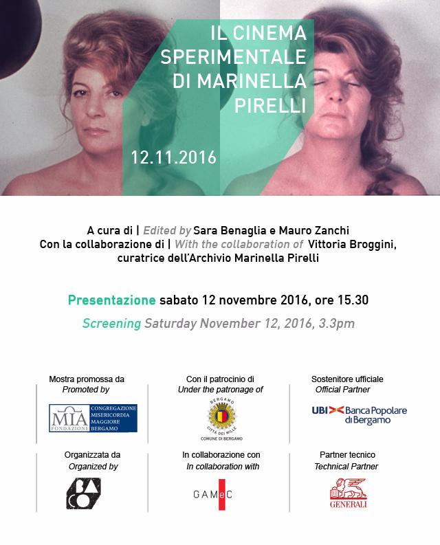 Marinella Pirelli (Verona 1925 - Varese 2009) è uno dei pochi artisti italiani ad avere lavorato nel cinema sperimentale. Ha operato per più di cinquant’anni, trenta dei quali isolata dal carosello sociale che fa girare il mondo dell’arte, lasciando opere importanti sia di arte cinetica sia opere, meno note, in 16 mm.