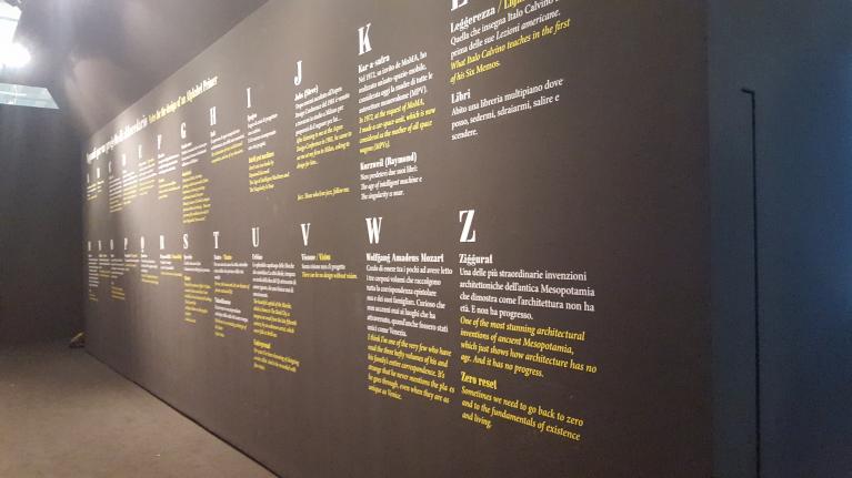 Sulla parete di fronte, completamente nera, campeggiano invece alcune parole chiave del ‘multiverso belliniano’. Si tratta degli “Appunti per un progetto di abbecedario”: