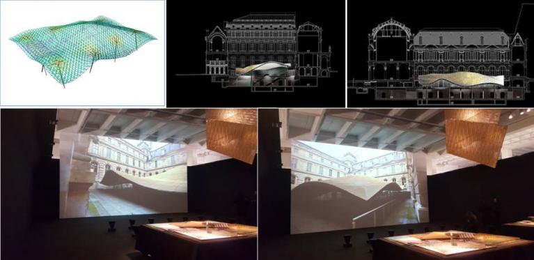 Il modello del velario del Dipartimento di Arti Islamiche del Museo del Louvre, due disegni di progetto e due vedute della Stanza della mostra milanese dove è il grande schermo con il video sonoro.