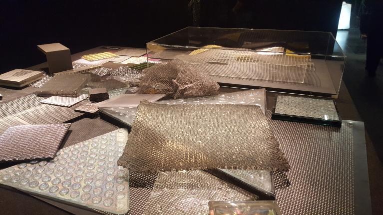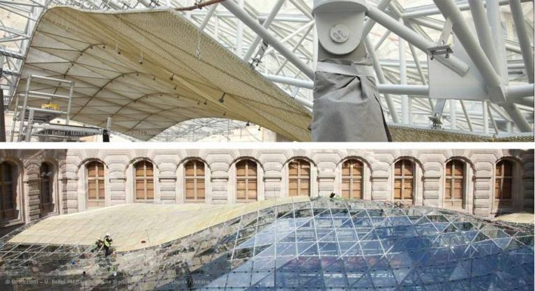 Sopra: Alcuni dei materiali costruttivi utilizzati per il velario del Dipartimento di Arti Islamiche del Museo del Louvre (2005-2012) esposti nella mostra milanese (ph. MLG). Sotto: dettagli dell’intervento progettuale.