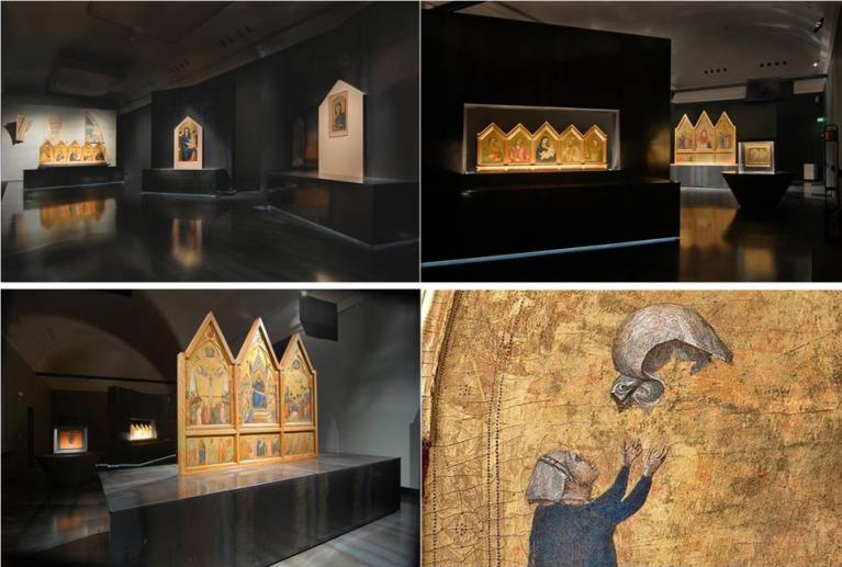 Milano, Palazzo Reale, 2 settembre 2015 / 10 gennaio 2016, mostra: “Giotto e l’Italia”, alcuni scorci dell’allestimento belliniano. (ph. Raffaele Cipolletta); a destra dettaglio del velo di Plautilla, dal verso del Polittico Stefaneschi.
