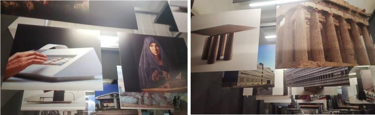 In alto: il calcolatore Logos 50-60 (Olivetti, 1973) e il leggio dell’Annunciata di Antonello da Messina; a destra: il tavolo Colonnato (Cassina, 1977) e le colonne di un tempio dorico. Sotto: Scorci della Galleria. (ph. MLG).
