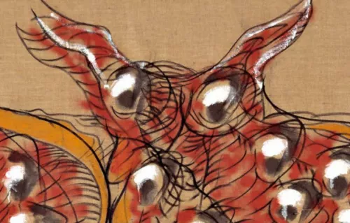 A dire il vero ciascuno dei tre quadrupedi si moltiplica: il contorno nero, rafforzato in alcuni punti dal rosso, dal giallo o dal bianco, non è uno solo, ma è formato da diverse linee, come se un animale ne contenesse altri, o racchiudesse l’intera eredità genetica della propria specie, l’ombra di chi lo ha preceduto, la proiezione di chi verrà. Pur essendo raffigurati in una prospettiva quasi frontale, attraverso l’ombreggiatura delle zampe e la leggera scalatura di piani fra di loro, ne percepiamo il movimento: sono animali vivi, che si muovono e ci guardano; come paiono guardarci, o riflettere il nostro stesso sguardo, i numerosi occhi che emergono in quegli stessi anni nelle opere di Carol Rama.