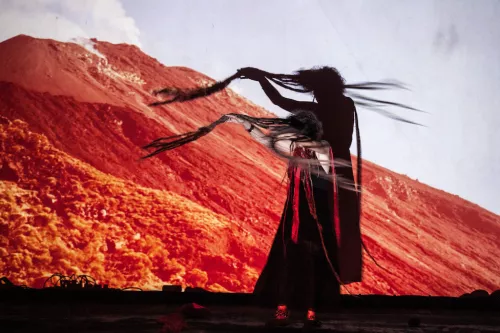 Questa rassegna di frammenti e schegge multisensoriali dall’isola si chiude – più che compiutamente – con Embrace the darkness, vero e proprio rituale che la musicista e performer Stefania Alos Pedretti ha costruito in residenza tra l’isola e la Fondazione Lenz di Parma, dove il lavoro ha debuttato a luglio in forma di studio. “Sono arrivata a Stromboli una settimana dopo l’incendio. C’era solo nero e odore di bruciato attorno a me. Abbiamo fatto molti sopralluoghi, raccolto suoni e immagini”. Le splendide fotografie di Giulio Di Mauro sono lo sfondo per un’esplorazione estetica ed emotiva che evoca l’anima del vulcano, le sue tinte dark, le sue sonorità più delicate – e analogiche – fino al rumore tellurico e elettronico delle esplosioni.