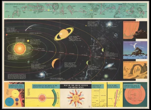 Illustrated map of the planets, Comparative sizes of the planets, Solar system.