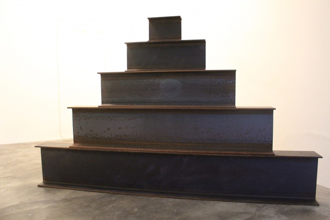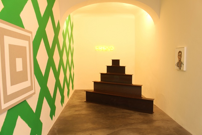Altra opera che Creed ha deciso di ripresentare per la mostra a Base è Work No. 1638, del 2013, una struttura modulare a ziqqurat, costituita da cinque longarine in ferro che si rastremano progressivamente verso l’alto: posta in maniera obliqua all’interno degli spazi espositivi, l’opera, nella sua elementarità e definizione, da una parte si caratterizza come realtà segnica autonoma e autoevidente, dall’altra come elemento di rottura, ma d’interazione, nella linearità del percorso espositivo. La ripetizione dei motivi romboidali del Wall Painting sembrano infine accompagnare chi guarda sino alla parete di fondo della galleria, dove il punto di fuga viene a coincidere con Work No. 672, Friend, un’installazione al neon del 2007, tanto fisica quanto rarefatta, tanto ermetica quanto evasiva, tesa a suscitare significati senza mai affermarli: segno e simbolo di quella che oggi viene identificata come estetica relazionale, il cui substrato generativo, per citare Nicolas Bourriaud, resta l’intersoggettività. La mostra, presso gli spazi della vivida realtà di BASE in San Niccolò a Firenze, sarà visitabile ancora per qualche settimana, oltre la data ufficiale di chiusura.