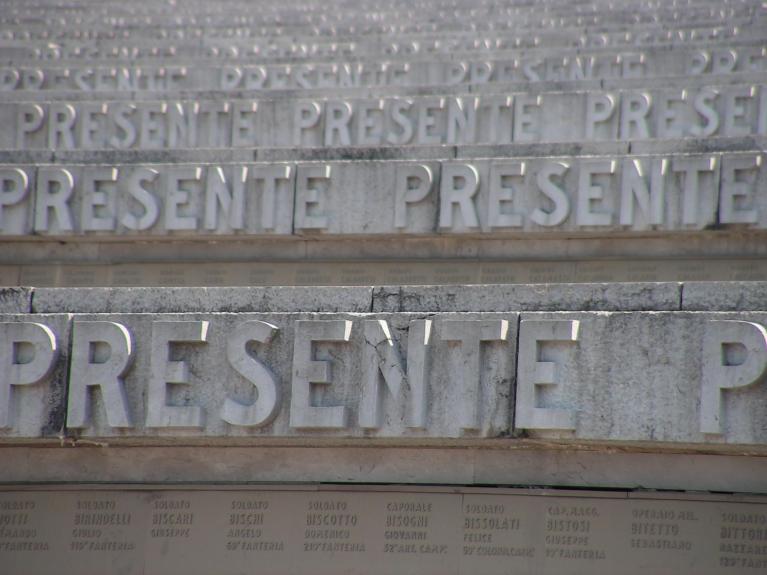 Luogo esemplare di questa rete discorsiva è Redipuglia (già Sredipolje), in provincia di Gorizia, i cui centomila sepolti ne fanno il maggior sacrario militare europeo e uno tra i più imponenti monumenti ai caduti della Grande guerra. Tra retoriche belliciste e dolore per la perdita, fin dalla fondazione del primo memoriale, antecedente all'attuale, Redipuglia è un tempio per il mito della nazione, fondato sull'immagine del sacrificio e centrato sulla fusione tra il luogo, teatro di combattimenti, e sepolture dei soldati. Inaugurato nel 1923 sul vicino colle sant’Elia, il sacrario ripensato dal fascismo del 1938 – è la sua forma ancora attuale – mostra le trasformazioni della religione politica fascista, nel senso di una ritualità dello Stato che trasferisce le credenze nel martirio e nella resurrezione dal piano personale a quello collettivo per farlo coincidere con la rigenerazione della “nuova” nazione. Con l'impressionante dimensione monumentale della struttura a gradoni aumenta il numero dei defunti fino a oltre centomila.