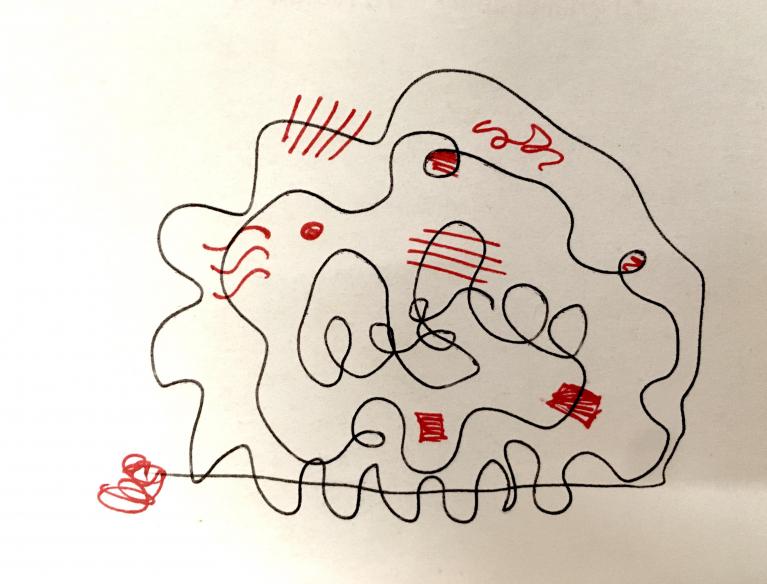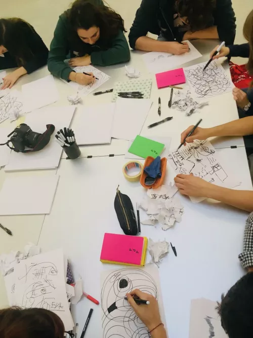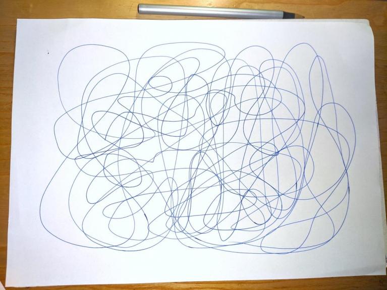 Nei miei tanti corsi di Disegno Brutto osservo che gli adulti amano espandere gli scarabocchi fino ai confini dei ventuno centimetri per quasi trenta del foglio a-quattro, sperimentano il limite di uno spazio finito, per riavvolgere le linee al centro e da lì ripartire. Amano l'intreccio.