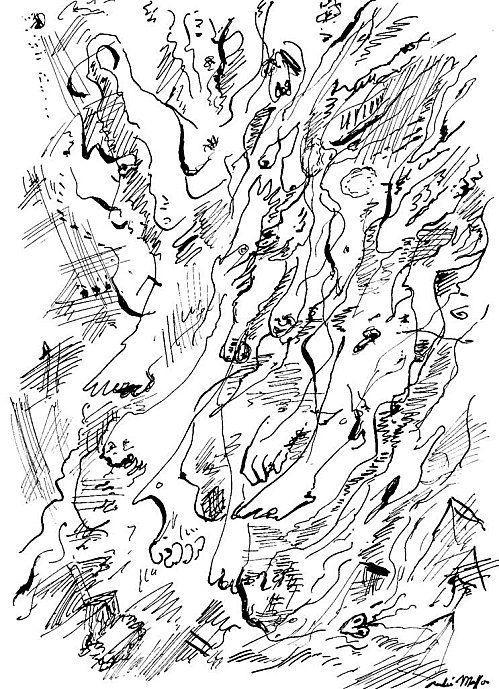 Una volta provato cosa vuol dire fare un disegno di questo tipo, automatico, inutile, non interpretabile, bisognerebbe chiedere a quei tanti adulti che trovano soddisfazione nello scarabocchiare parlando al telefono e nel nervoso zigzagare della penna durante una riunione, se sanno perché lo fanno. Forse canalizzano una smania che le membra hanno di fare altro, di essere altrove, una gran voglia di fuggire: il loro corpo, scarabocchiando, trova la calma, si acquieta nel qui ed ora e sublima con i segni la fuga già progettata.