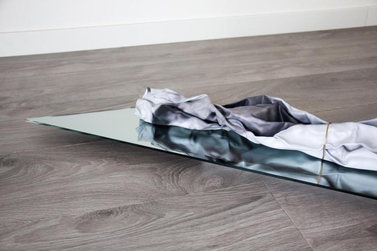 Loose (2017) di Christian Fogarolli è parte del progetto Lost Identities realizzato nell’arco di diversi anni in collaborazione con istituzioni psichiatriche italiane. La ricerca, che parte dall’approfondimento della fotografia giudiziaria di primo Novecento, è caratterizzata dall’indagine fotografica e dalla ricognizione d’archivio. Loose è composta da una sottile lastra in piombo impressa a pigmenti e ripiegata successivamente a mano. I dettagli della figura femminile sono visibili solamente attraverso la riflessione di una lastra specchiante che fa da supporto alla immagine scultorea, distesa e legata.
