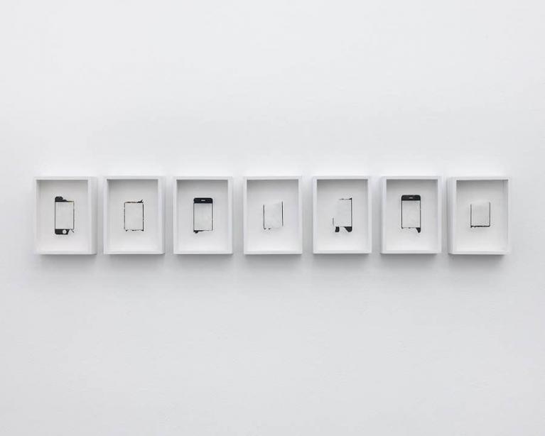 Anche la serie The Night Watch di Simone Bergantini – costituita da immagini di schermi infranti, display distrutti – pare aprire più a una presenza scultorea che a rimandare alle immagini bidimensionali che ogni smartphone visualizza e conduce. Queste presenze sono una riflessione sul rapporto inversamente proporzionale che la fotografia ha sviluppato nella sua storia, in relazione ai supporti fisici a cui si è affidata, dove, in termini di quantità di informazioni, fotografia e oggetto perdono di senso se osservati come una unità. In un’altra opera Bergantini mette in relazione e a confronto visivo tre cieli digitali, ricreati con i codici pantoni dei social più celebri (Twitter, Facebook, Instagram). Tiene traccia dei colori utilizzati nel tempo dai principali portali web di aggregazione di massa, per creare un archivio di campioni cromatici guardati a monitor e al tempo dedicato alla navigazione, proprio con un atteggiamento simile a quello che un viaggiatore avrebbe potuto guardare e prendere appunti sui cieli e sulle terre incontrate.