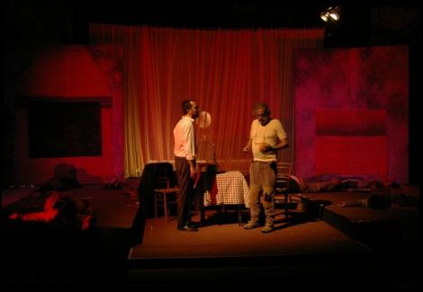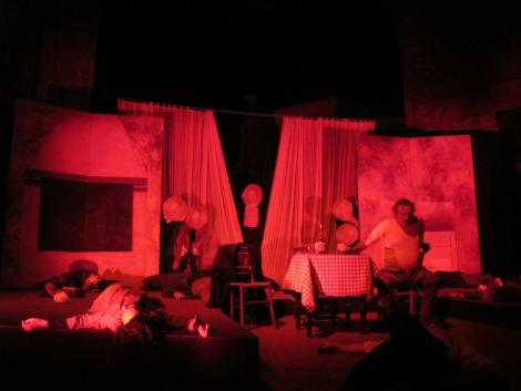 Lo spettacolo di quest’anno parla dell’apocalisse della crisi, del timore per un mostro che non dominiamo e che sembra straziarci, divorarci. Ma la situazione internazionale e quella nazionale vengono rivissute riprendendo un’antica, sapida, divertente favola, che già era stata messa in scena, con altri echi, qualche anno fa: quella di Campriano contadino. Il Campriano di oggi è un cassaintegrato, un licenziato o forse un esodato che prova a campare vendendo vasetti di miele fatti nel podere. Al posto degli antichi speziali che provano a comprarglielo frodandolo, guadagnandoci oltre il dovuto, ci sono tre tipi di pescecani contemporanei: il politico che parla di figli e parenti da sistemare, il tecnocrate che punta tutto sulla comunicazione, l’esperto di alta finanza, il più vorace di tutti, con figli avviati a diventare sciacalli, iene, avvoltoi… Tutti e tre fanno offerte indecorose per il miele, e il buon contadino le rifiuta con sdegno, ricordando anche le lotte del passato. Il piano realistico, quello favolistico, quello simbolico-onirico si intrecciano continuamente in una recitazione epica, sotto luci cariche di colore da melodramma, in una scena semplice, con interni disegnati in modo naif rivelati via via e una tenda di fondo che genera spettri di un presente minaccioso o cari fantasmi di antenati consiglieri.