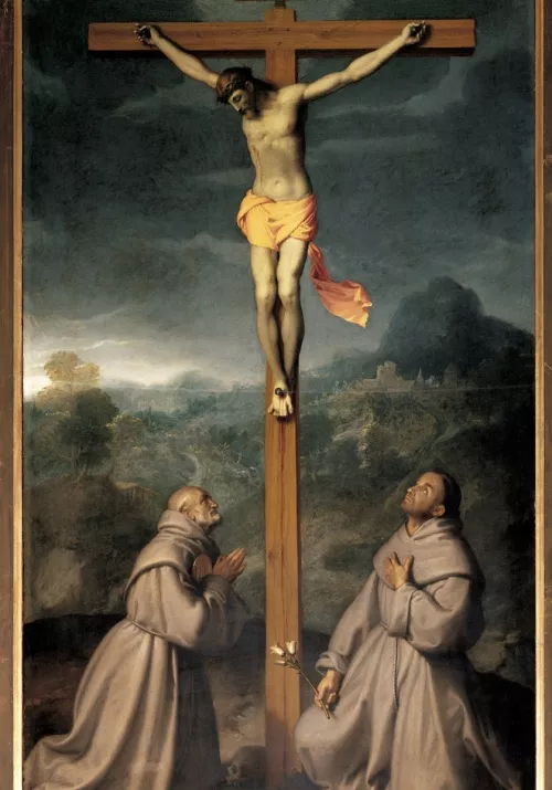 Si prenda ad esempio il “Cristo portacroce” (1575-77), tutto concentrato in se stesso, preso dalla propria pena, dal peso non solo fisico che sta sopportando in perfetta solitudine, in un paesaggio spoglio, vuoto, senza fedeli o spettatori, senza nemmeno rivolgere a chi osserva quello sguardo straziante, venato di sangue, che caratterizza altri Portacroce dal taglio ravvicinato, con quasi la sola corona di spine e un frammento della croce, come quello giorgionesco della Scuola di San Rocco o quello tizianesco dell’Ermitage, struggente al limite del sopportabile.