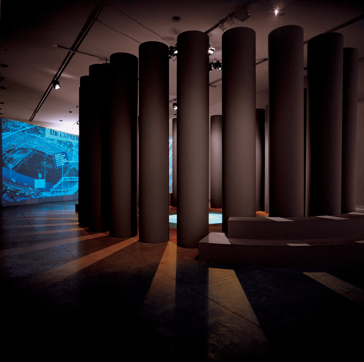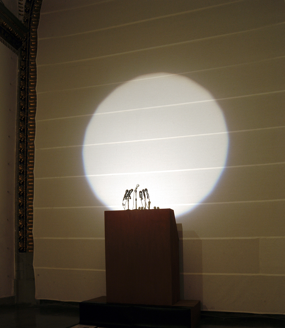 Padrone disinvolto della grammatica del video, delle installazioni e delle composizioni sonore, per il sound corner Muntadas si cimenta con la possibilità di rinnovare l’immagine attraverso la sottrazione. Stadium I-XI (1989-92), Home. Where is Home? e The Press Conference Room (1991), sono le tre opere in questione. Rispettivamente un’analisi sul significato, le caratteristiche, le funzioni e il potere di trasformazione degli stadi, come luogo centrale della scena (“who take the center of the stage”); la casa come dimensione privata, e psicologica, non legata alla dimensione fisica di un luogo; infine la forma archetipica della retorica del discorso pubblico. Delle tre opere restano i suoni. Tre momenti che attraversano i luoghi fisici del privato e del pubblico nei loro momenti di incontro attraverso i media: la casa, vissuta intorno al focolare e intorno alla televisione (siamo ancora negli anni ottanta!), lo stadio, luogo collettivo di spettacoli di musica pop, manifestazioni sportive e politiche, le conferenze stampa, vere e proprie performance di uomini politici e di potere attraverso le quali entrano nel panorama visivo pubblico, e privato, interpretando di fatto un ruolo. Tutti i suoni di questi momenti scandiscono le tre visioni, nel momento in cui l’immagine dell’installazione è sottratta.