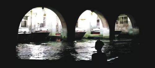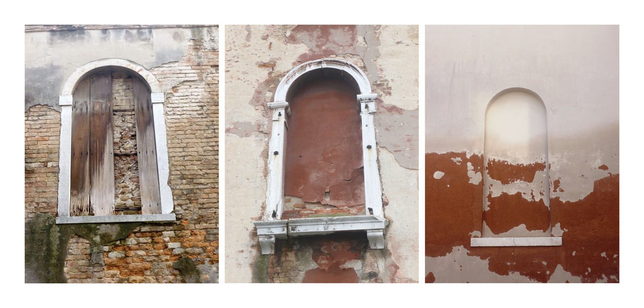 Finestre e porte murate, citofoni antichi, tombini di scolo in pietra, tubi di scarico a vista, grate agli angoli dei vicoli per evitare che diventino vespasiani improvvisati, paratoie sulle porte per proteggere gli interni dall’acqua alta. Immagini che da secoli compongono per molti la scenografia di un contesto quotidiano, diventano agli occhi dell’estraneo straordinarie. Così il video già mostrato nel 2013 alla Galleria Micaela Rizzo, è un’immersione all’interno dei canali veneziani da cui si scorgono i ponti e le calli, se ne riconoscono gli scorci, e si vede Venezia dagli occhi di un veneziano. Il video accompagnato dall’audio che sottolinea il movimento d’acqua sotto la barca. A Path of Least Resistance.