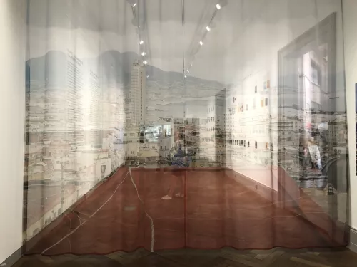 Nel bell'allestimento del S AM la prima sala, sottratta alla sequenza delle successive, viene ad assumere il ruolo di una vera e propria introduzione. È qui che i curatori offrono un assaggio di quell'atlante cronotopico che Gianluigi Freda nel libro aveva suggerito come possibile forma ideale per un'esplorazione napoletana; ed è sempre qui che mettono in mostra Le mani sulla città di Francesco Rosi, film cardine sulle vicende dell'urbanistica partenopea del dopoguerra più volte citato nei saggi che arricchiscono il libro.
