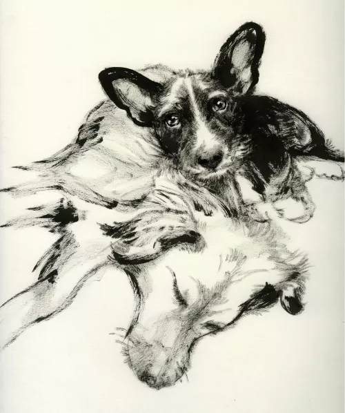 Giovanni, il loro padrone, mi ha chiesto il ritratto di Kurama, il “bello” dei due, da regalare alla sua compagna e io gli ho chiesto di descrivermi il carattere del soggetto. Riporto ciò che mi aveva scritto: – Ha il pelo morbido, è un cane estremamente dolce, intelligente e chiacchierone. Esegue comandi, caccia, fa un sacco di cose “da cane” ed è felice, mette il buonumore. Quando lo abbiamo visto nel canile ci siamo subito innamorati di lui –.