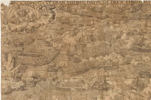 Forse nessuna delle illustrazioni della battaglia di Lepanto entra nel vivo del conflitto come quella incisa da Domenico de Franceschi (1572). La descrizione delle navi della Lega e degli Ottomani è particolarmente minuziosa, e così la segnalazione dei diversi comandanti. Una cura speciale viene riservata alle insegne degli uni e degli altri, molto più che semplici mezzi per distinguere le imbarcazioni: alcune grandi bandiere vengono esposte a poppa, mentre lunghi stendardi sventolano in alto sugli alberi. Su tutte le insegne spicca il leone di San Marco, scelta ben comprensibile visto che anche questa incisione venne pubblicata a Venezia: ben presto, infatti, Lepanto assume i contorni di un evento leggendario, capace di contribuire a sua volta all’immagine mitica di Venezia, della sua prosperità e della sua potenza politica e militare.