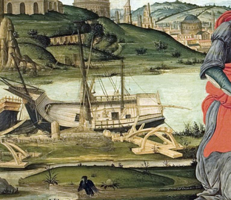 Che cosa ci fa infatti quel bastimento – inutile dire, una nave della seconda metà del Quattrocento – appoggiato alla riva e tutto reclinato su un fianco? Quali riparazioni servono, oppure va solo incatramata? Così piegata, la nave si mostra in un’abbondanza di particolari che forse non ha confronti nella pittura rinascimentale. A differenza dell’albero maestro e di quello di poppa, l’albero di prua è pericolosamente inclinato in avanti, verso il bompresso; scorgiamo le funi e i bozzelli, vediamo bene il fasciame del ponte, tre aperture verso la stiva, e una scaletta a pioli. Ma i pennoni sono nudi, nessuna traccia delle vele. La minuzia analitica prosegue anche sulla riva, dove rimane una grande bitta per l’ormeggio e dei cordami gettati sull’erba. Ma che cosa sono le due complesse strutture  in legno posate a terra e mirabilmente descritte in prospettiva: sono forse elementi della fasciatura interna dello scafo?