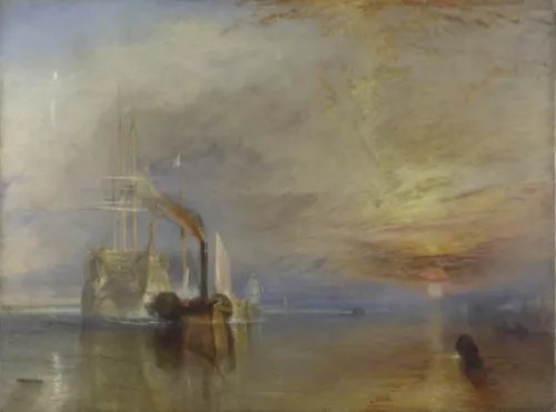 A suo modo, è un tributo alla vecchiaia di una nave anche il quadro di Turner dedicato all’ultimo viaggio della Temeraire (1838-1839). Quale ora migliore della luce declinante del tramonto per accompagnare la fine di un’imbarcazione? Un rimorchiatore davanti e un altro dietro portano la grande nave da guerra – non più temeraria come una volta – verso la demolizione. La fiamma che esce dall’alto fumaiolo del rimorchiatore è anche un annuncio: la stagione dei grandi velieri sta per finire e si apre uno nuovo paesaggio di materiali, di forme, di tecniche di propulsione.