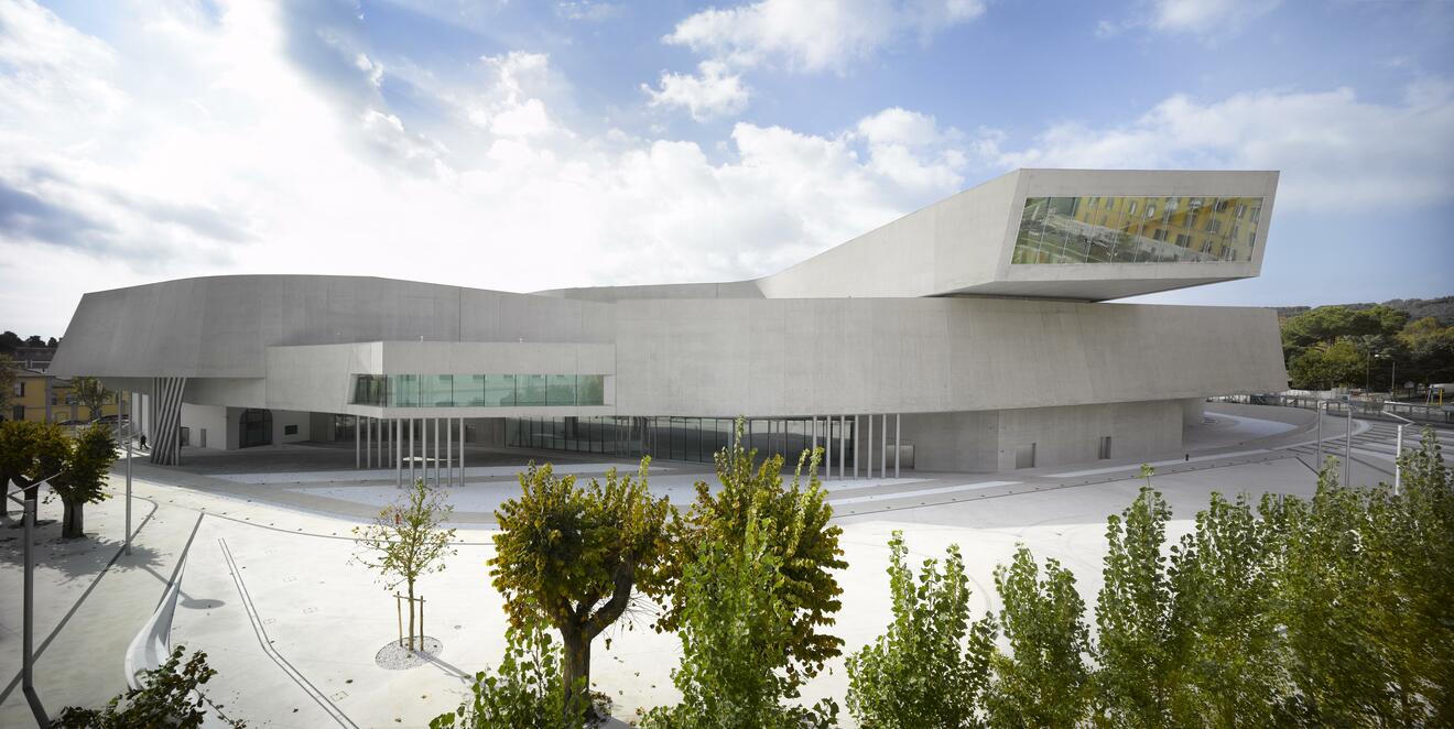 Sulla malleabilità del calcestruzzo (e perciò anche sulla sua capacità di modellazione secondo un’alternanza di pieni e di vuoti, con il raggiungimento di originali effetti di porosità) si basa il Phaeno Science Center a Wolfsburg (2000-05): un piatto e irregolare trapezio sollevato su eterogenei pilastri scultorei che lascia libere al proprio interno diverse cavità dai perimetri anomali destinate all’esposizione e alla comunicazione scientifica. Questa plasticità curvilinea, evocativa della morfologia delle stratificazioni geologiche, si mescola con la linearità declinante secondo varie pendenze delle finestre e con il gettarsi a sbalzo del corpo principale dell’edificio, cuneo fluttuante a mezz’aria che prorompe dal suolo.