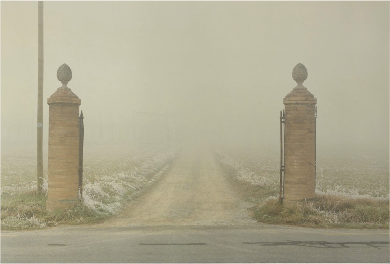 La foto di Ghirri ritrae una delle stanze dello stabilimento di cure termali di Salsommaggiore; la posa sembra quella di una persona che sta riflettendo. L’avvolgono i fumi della camera per la cura delle malattie respiratorie. L’opacità è uno stato simile a quello della sospensione indotta dal sonno, nella soglia tra il giorno e la notte. Così è anche la fotografia delle due pilastri del cancello spalancato a Formigine, vicino a Modena. Il cancello quasi non si vede; appare piuttosto un confine, che ci introduce in un mondo che si spalanca al di là dell’ingresso, davanti a chi guarda, uno spazio che la nebbia circoscrive e limita: l’aperto e il chiuso. Un’altra soglia da varcare. La strada è lì dinanzi, che attende con la sua promessa di percorribilità.