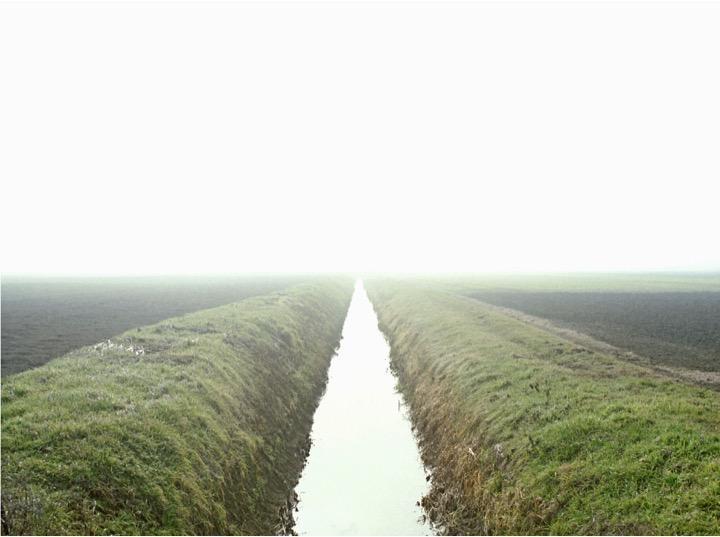 Due fotografie scattate da Ghirri, e stampate dopo la sua morte dalla moglie Paola, danno perfettamente il senso di questa vaghezza. Nella prima si vede un fossato che partisce l’immagine, mettendo in rilievo le due rive erbose, a destra e a sinistra, quindi la superficie dell’acqua al centro, che è come una lama trasparente in cui si specchia il biancore della nebbia. Ghirri ha fotografato la nebbia, ma questa quasi non si vede; la nebbia crea quel limite lattiginoso, che è la linea immaginaria dell’orizzonte, là in fondo, dove terra e cielo si toccano e si estendono l’uno nell’altro grazie proprio al biancore. Immagine della vaghezza, questa fotografia intreccia opacità e trasparenza: rende trasparente l’opaco e opacizza la trasparenza.