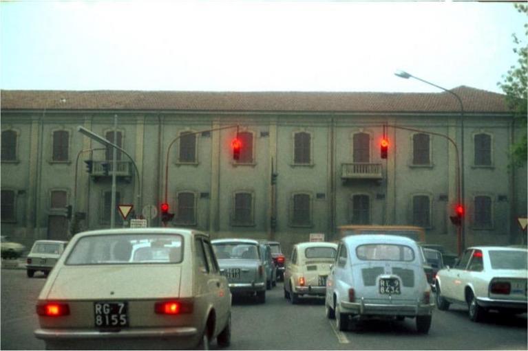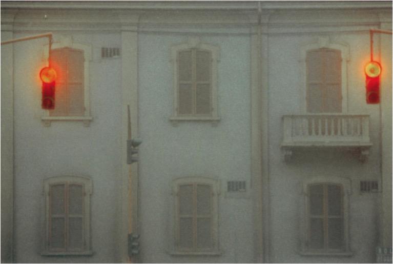 In un’altra immagine si scorgono due semafori sospesi, in alto. Una leggera foschia sembra circondarli; il colore rosso dello stop si riverbera all’intorno. Ghirri ha scattato l’immagine stando in fila dietro ad altre automobili, un’immagine presa al volo, come mostra una versione differente dello scatto. Stampandola il fotografo ha però tagliato via le auto ferme e lasciato solo i due semafori con il loro alone: sembrano immersi in una leggera cappa di nebbia. La nebbia però non c’è. Appare come un modo di vedere.