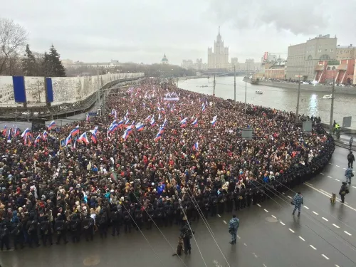 Un nutrito gruppo di manifestanti, si parla di 50-60.000, ha marciato a Mosca, e in numero minore in altre città del paese, il 1 marzo 2015 nei luoghi assurti a simbolo di spazio consacrato alla cultura politica e alla memoria, dopo l’omicidio di Nemtsov, per ricordarlo e per condannare le modalità di gestione politica che a questo omicidio hanno portato, da qualunque parte sia stata armata la mano che lo ha compiuto. La marcia era prevista per il giorno successivo, intesa e autorizzata, contro la situazione di crisi, Ucraina e sanzioni, ma è stata prontamente trasformata in corteo funebre. L’iniziativa ha raccolto consensi ma anche suscitato qualche perplessità: si marcia per qualcuno o contro qualcuno, si chiedevano alcuni sul web mentre i partecipanti si radunavano e sfilavano con tradizionali cartelli che riproducevano il ritratto di Nemtsov e slogan di varia natura. Il più originale è forse stato quello che giocando con il nome della vittima, Boris, ha aggiunto una lettera finale che in russo trasforma il nome proprio nell’imperativo del verbo lottare. Boris è diventato quindi boris’, “Lotta!”