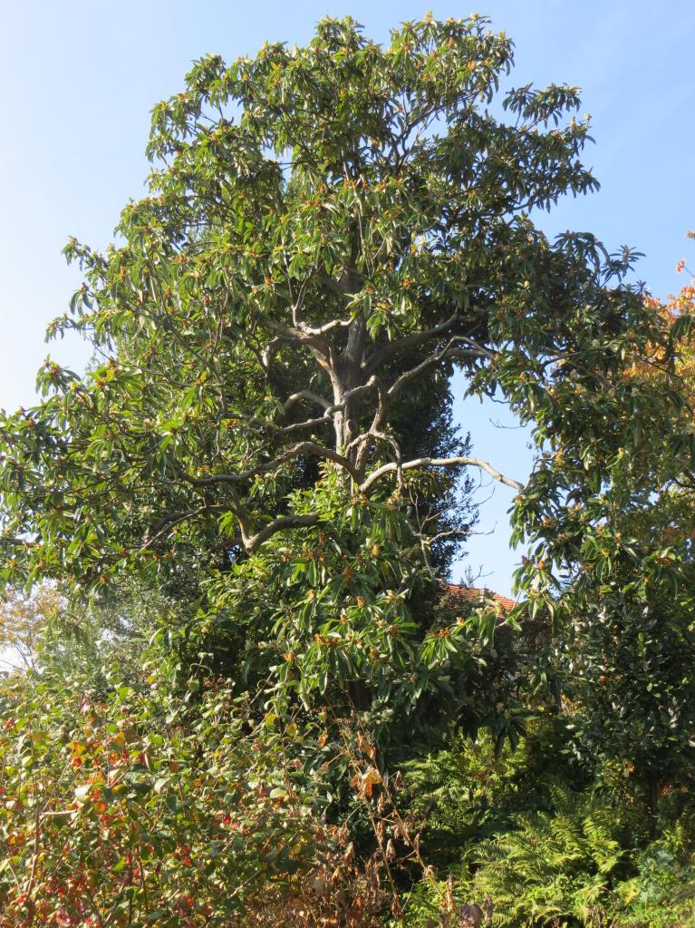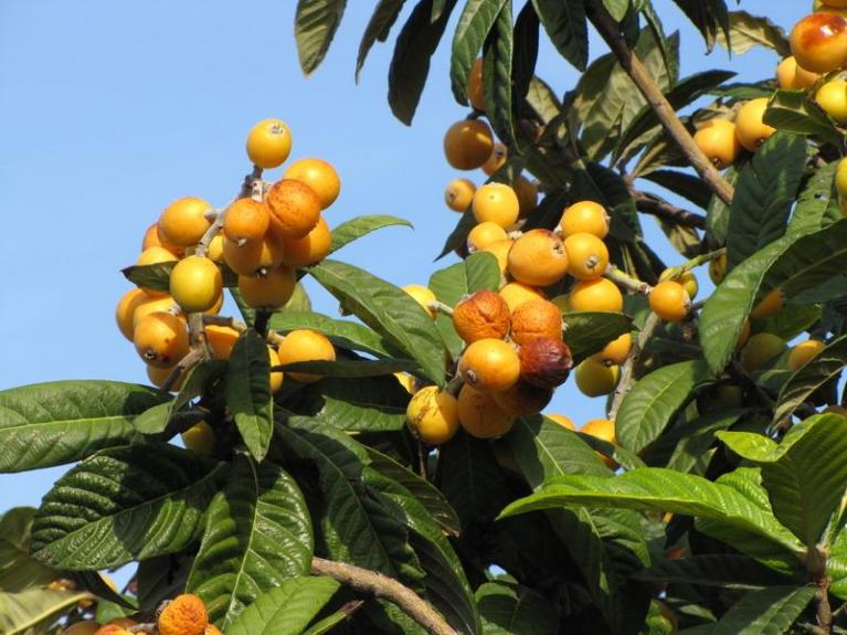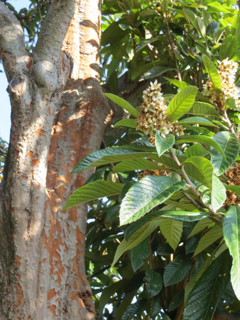 Quando per i fruttiferi è tempo di raccolto, il nespolo giapponese fiorisce: rigide, bronzee pannocchie lanose e dense di piccoli fiori chiari si ergono all’apice dei rami, spiccano sulle lunghe lance delle foglie, lucide, coriacee e persistenti, tomentose anch’esse nel verso e nel picciolo breve. I gialli pomi maturano in primavera: poco meno grandi di un uovo, contengono tre o quattro grossi semi bruni ma avvolti da una polpa succosa, dolce e aspretta e rinfrescante, dalle molte proprietà.