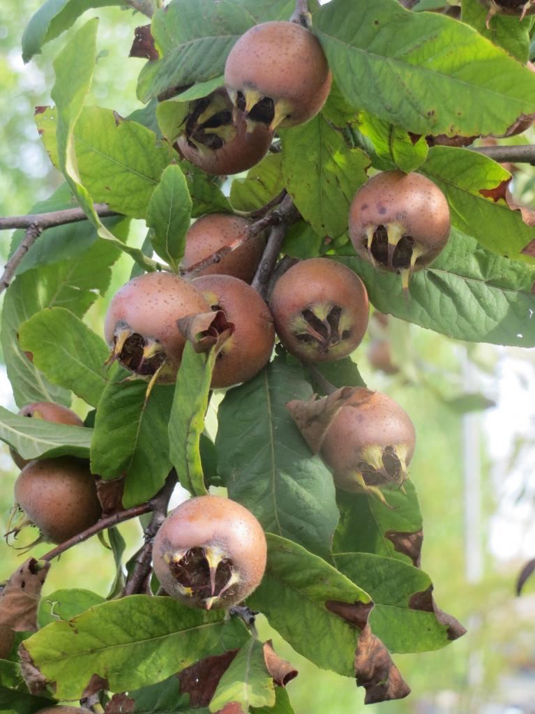 Fruttifica poi in autunno con piccoli pomi rugginosi (falsi frutti) dalla caratteristica cavità apicale depressa e circondata dalle lacinie residuali. Anch’essi ornamentali, sono poco appetibili (cinque e grossi i noccioli) e richiedono di ammezzire o sulla pianta o – meglio – in cassette di legno tra la paglia, per lasciar fermentare a dovere la scarsa polpa. Da qui, appunto, il proverbiale incentivo alla saggezza paziente.