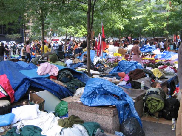 Da lontano Liberty Plaza sembra un bivacco di barboni. Non è permesso montare tende e allora l’accampamento viene fuori un po’ caotico: sacchi a pelo, materassini, asciugamani, gente che apre gli occhi, si stira, dorme ancora di brutto… fa colazione. Mi faccio strada in mezzo agli occupanti e noto con sorpresa l’assenza totale della puzza di pipì. Pensavo che fosse inevitabile viste le precarie condizioni di vita, invece non ce n’è per niente, fatto sorprendente per uno come me abituato al centro storico di Genova dove invece la si sente sempre anche se la gente ha il gabinetto in casa. Nonostante il disordine il posto è pulito, girano due ragazzi con scopa e paletta, ma si vede anche che ognuno il suo spicchio di piazza se lo tiene in ordine. Oggi è un giorno di folla e faccio fatica a muovermi, ma nel pigia pigia riesco però a rendermi conto che l’organizzazione del presidio è molto curata. Zuccotti Park è una micro-comunità, con servizio lavanderia, la cucina, una libreria, vari stand informativi, un gruppo teatrale e il servizio medico. Al centro della piazza c’è il nucleo operativo del movimento, 4-5 computer collegati a misteriose fonti di energia, con alle tastiere dei ragazzi che devono essere dei miracolati della concentrazione per lavorare in quella confusione. Mi immagino che mandino in giro comunicati, curino il sito web, sparino nel cosmo tutto quello che succede a Liberty Plaza.