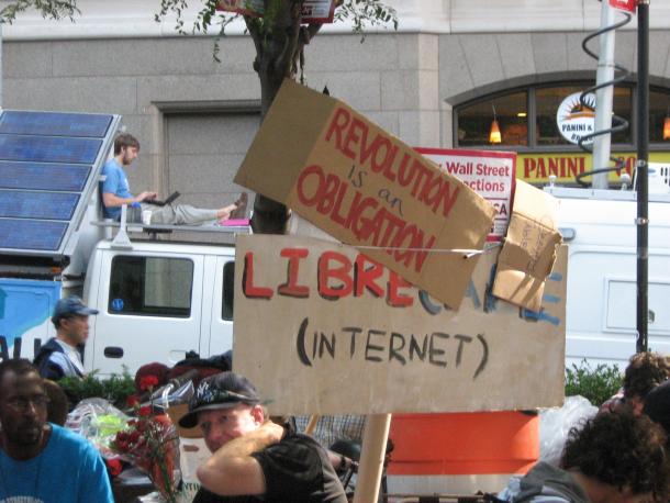 I giovani sono in maggioranza quest’è chiaro, in generale bianchi, ma di gente di altre età e di altre razze ce n’è abbastanza per poter dire che uno spaccato rappresentativo della società si è dato appuntamento qui. Ma quella che si vede in questa piazza è solo una faccia di questo movimento, perché c’è anche l’altra, quella che appare sul web, è indissolubile dalla prima ed incredibilmente articolata ed efficiente. Sì perché quei tipi lì al lavoro sui tavoli e le panchine dei giardinetti gestiscono un sito web che funziona alla perfezione, molto meglio di quello di molte università italiane, si coordinano con un sito-ombrello, “OccupyTogether”, a cui fanno riferimento più di 1000 occupazioni in tutti gli Stati Uniti, vanno su Twitter, gestiscono una pagina Facebook, filmano tutti gli eventi per sbatterli subito su Youtube e infine fanno funzionare una webtv dove in stream si possono vedere dal vivo cortei, arresti e maltrattamenti. Dire quale delle due facce sia virtuale e quale reale è ozioso, in realtà vivono una dentro l’altra come in un circolo, così che per la prima volta capisco, però solo su scala binaria, il funzionamento della Santissima Trinità.